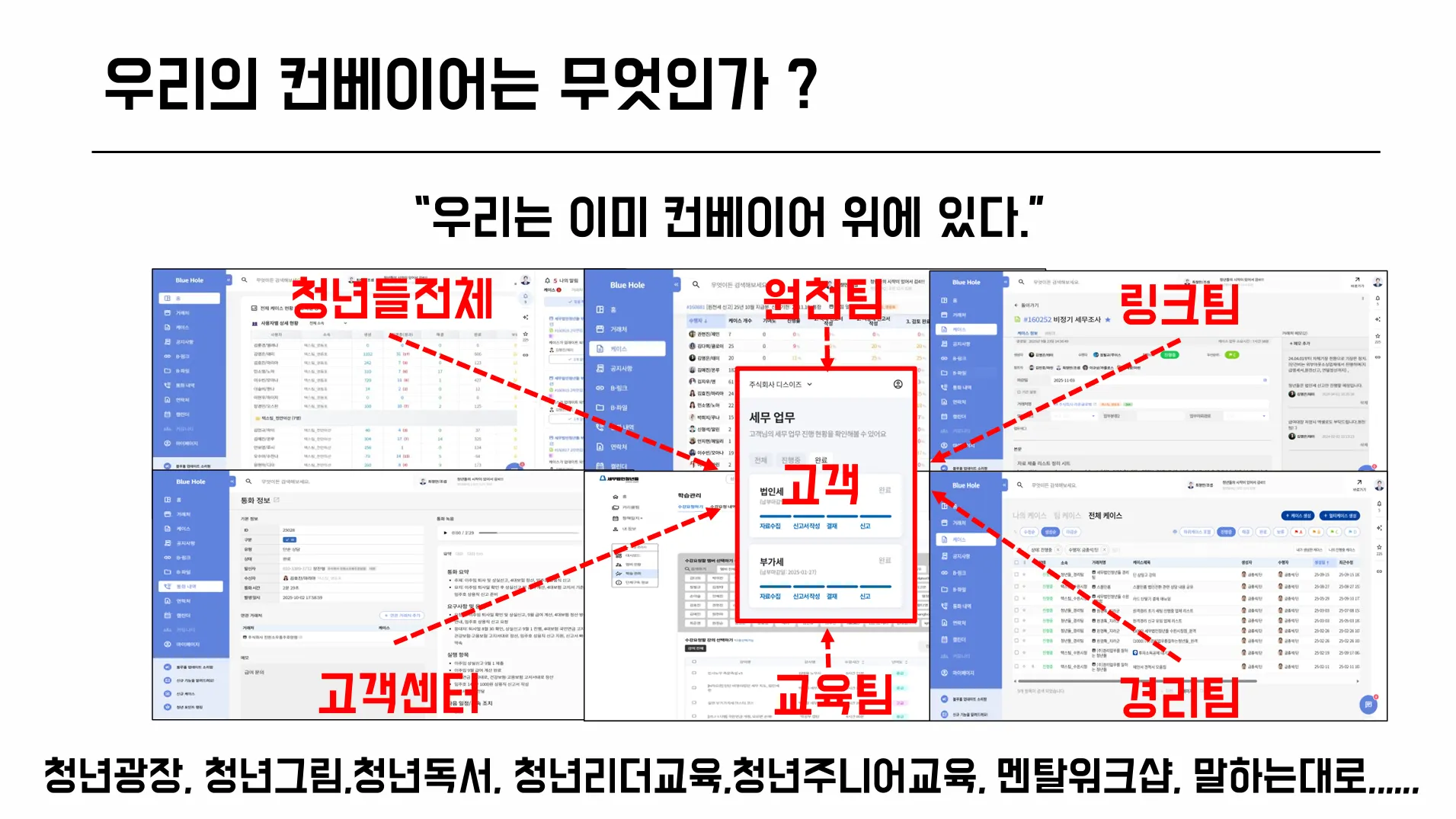 택스팀,원천팀,경리팀,교육팀, 고객센터가 블루홀을 통하여 하나로 연결되어