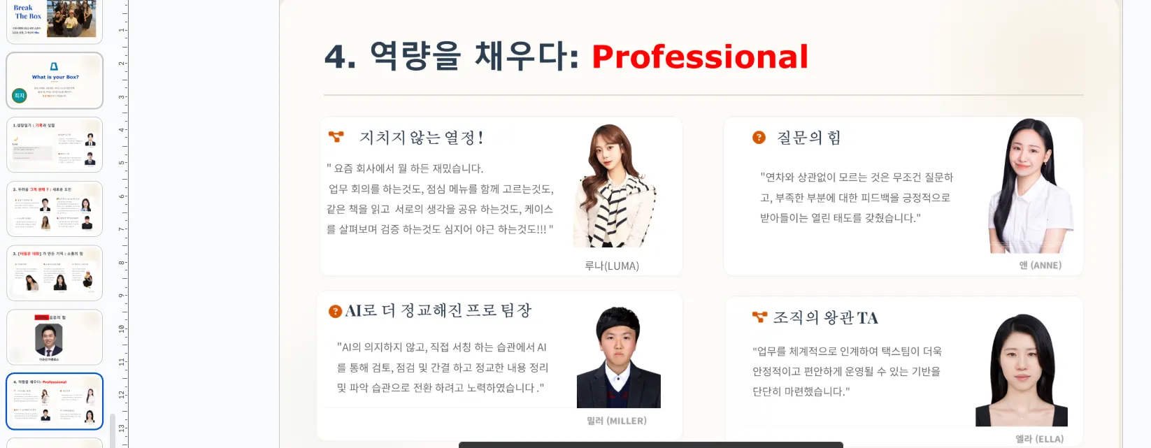 → 각 지점에서 올 한해 모두가 한계를 의미하는 박스에 대해 어떤 박스를 깨며 성장 했는가를 발표하는 시간