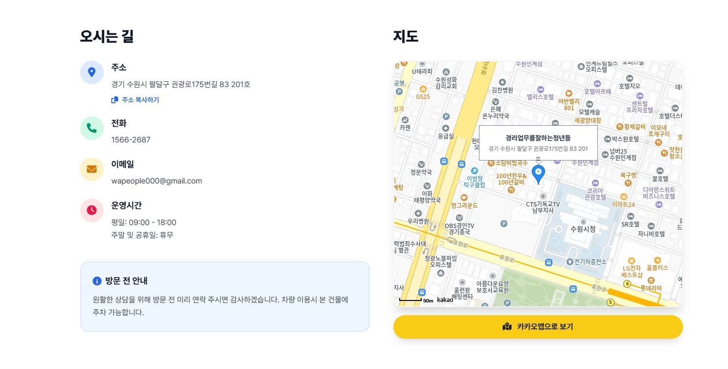 또한 지도 영역이 다른 콘텐츠와 어색하게 겹치지 않도록 레이아웃을 수정하고, 모바일 환경에서도 불편함 없이 사용할 수 있도록 반응형 동작을 점검했습니다. 작은 차이처럼 보이는 부분들이지만, 실제로는 사용자 경험에 큰 영향을 준다는 점을 다시 한 번 느꼈습니다.