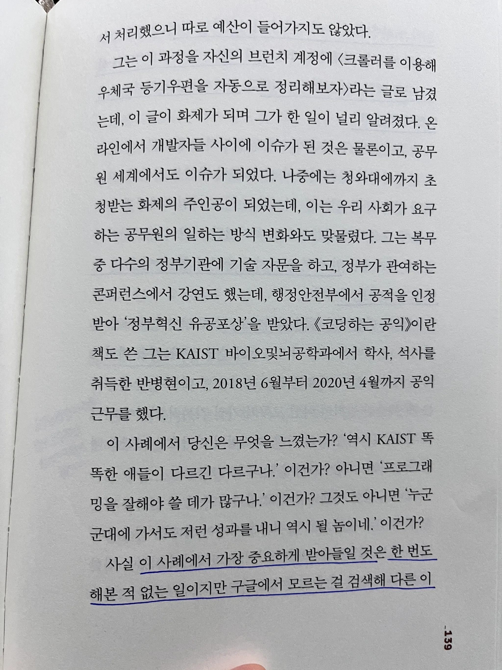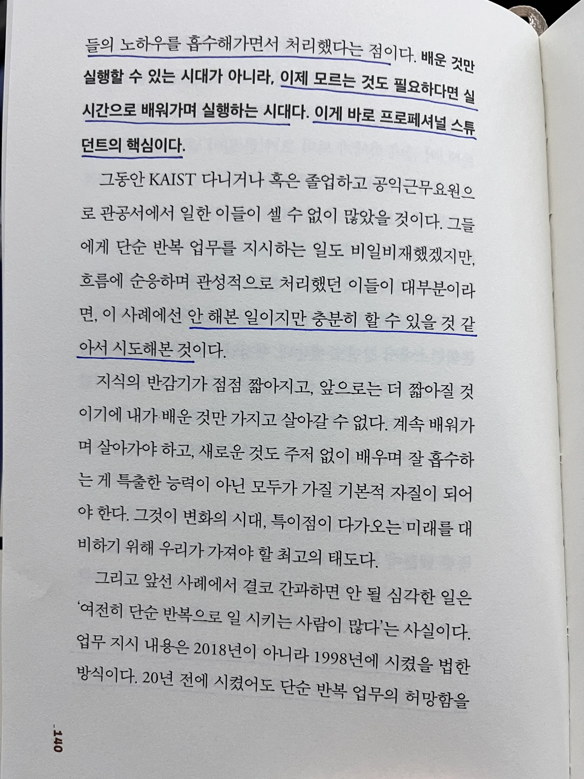 “모르는 것도 필요하다면 실시간으로 배워가며 실행하는 시대”라는 내용을 읽고 아침에 본 청년철학 영상이 생각났다. 영상을 통해 내가 깨트려야 할 우상이 동굴의 우상이라고 생각했는데, 책을 읽으며 한 번 더 생각을 다지게 되었다. 내 경험을 토대로 한 것들을 깨치고 새로운 것을 계속 배우는, 프로페셔널 스튜던트로 학습하자.