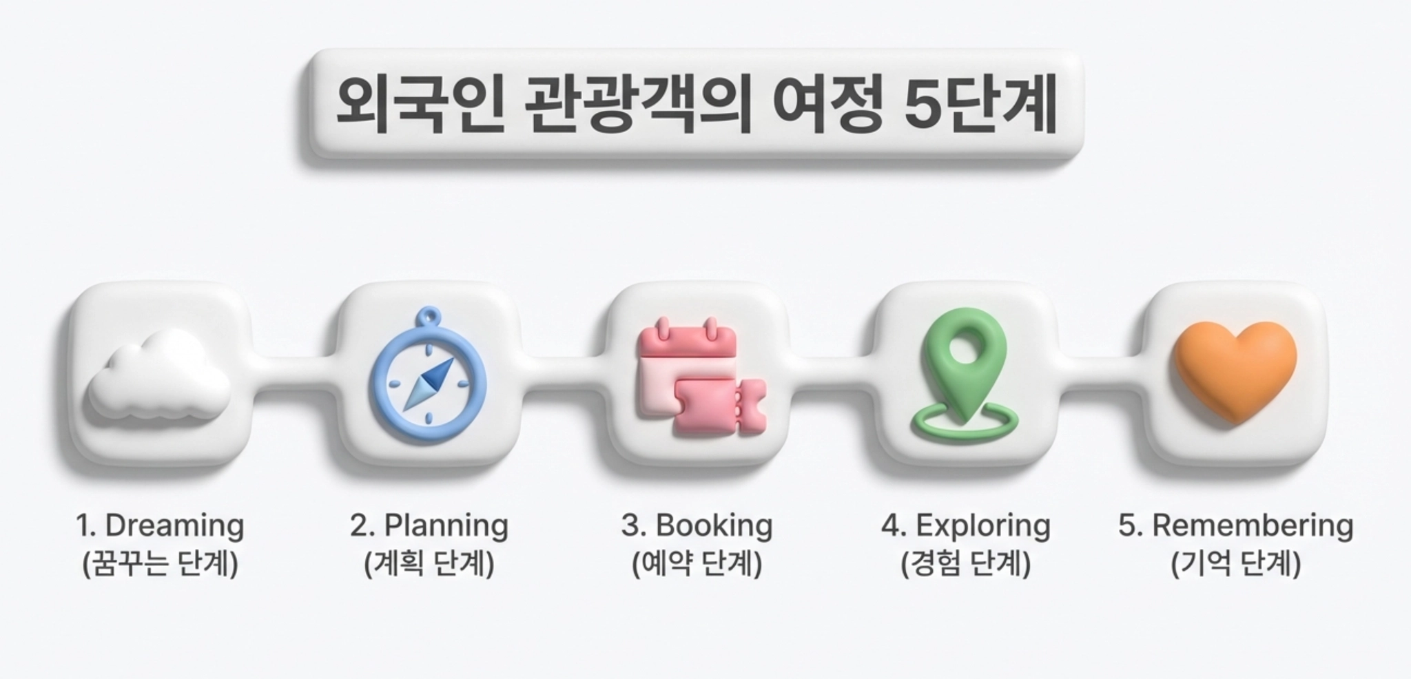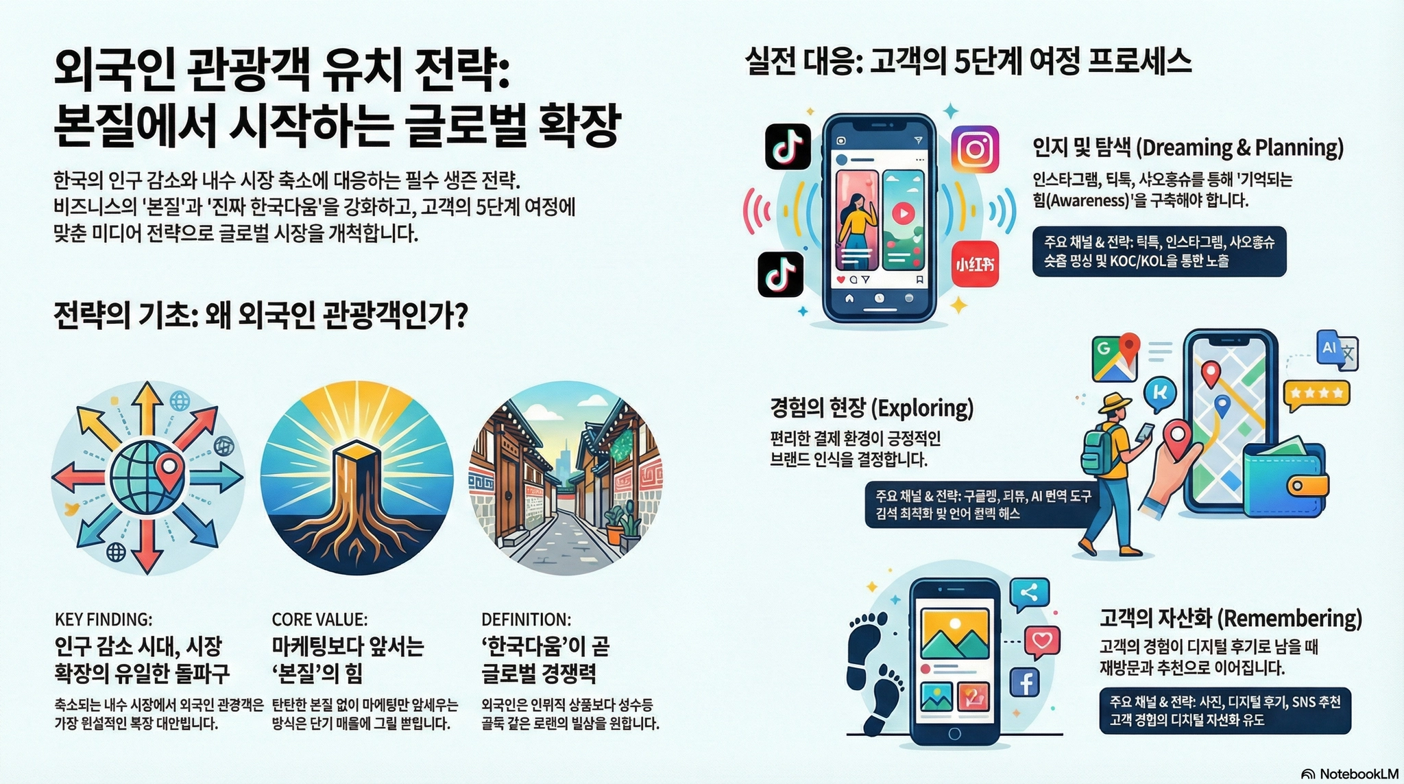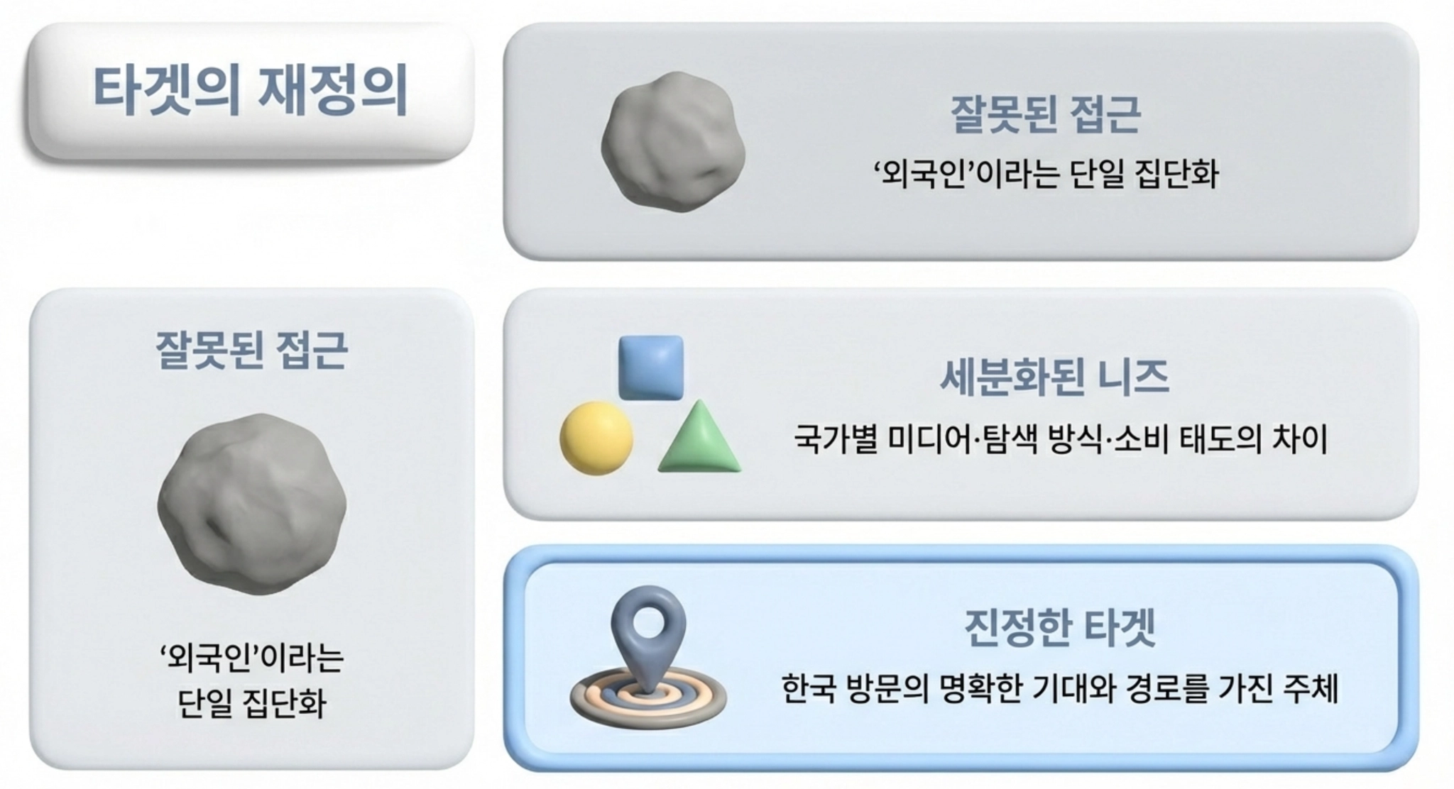 외국인 관광객은 하나의 집단이 아니다. 크게 보더라도 중국, 일본, 미국 등으로 나뉘며, 이들은 사용하는 미디어도, 정보를 탐색하는 방식도, 소비 태도도 다르다. 같은 ‘외국인’이라는 이유로 하나의 마케팅 전략을 적용하는 순간, 이미 경쟁력을 잃는다. 결국 중요한 것은 ‘외국인’이 아니라 ‘어떤 경로로, 어떤 기대를 가지고 한국에 오는 사람인가’다.
