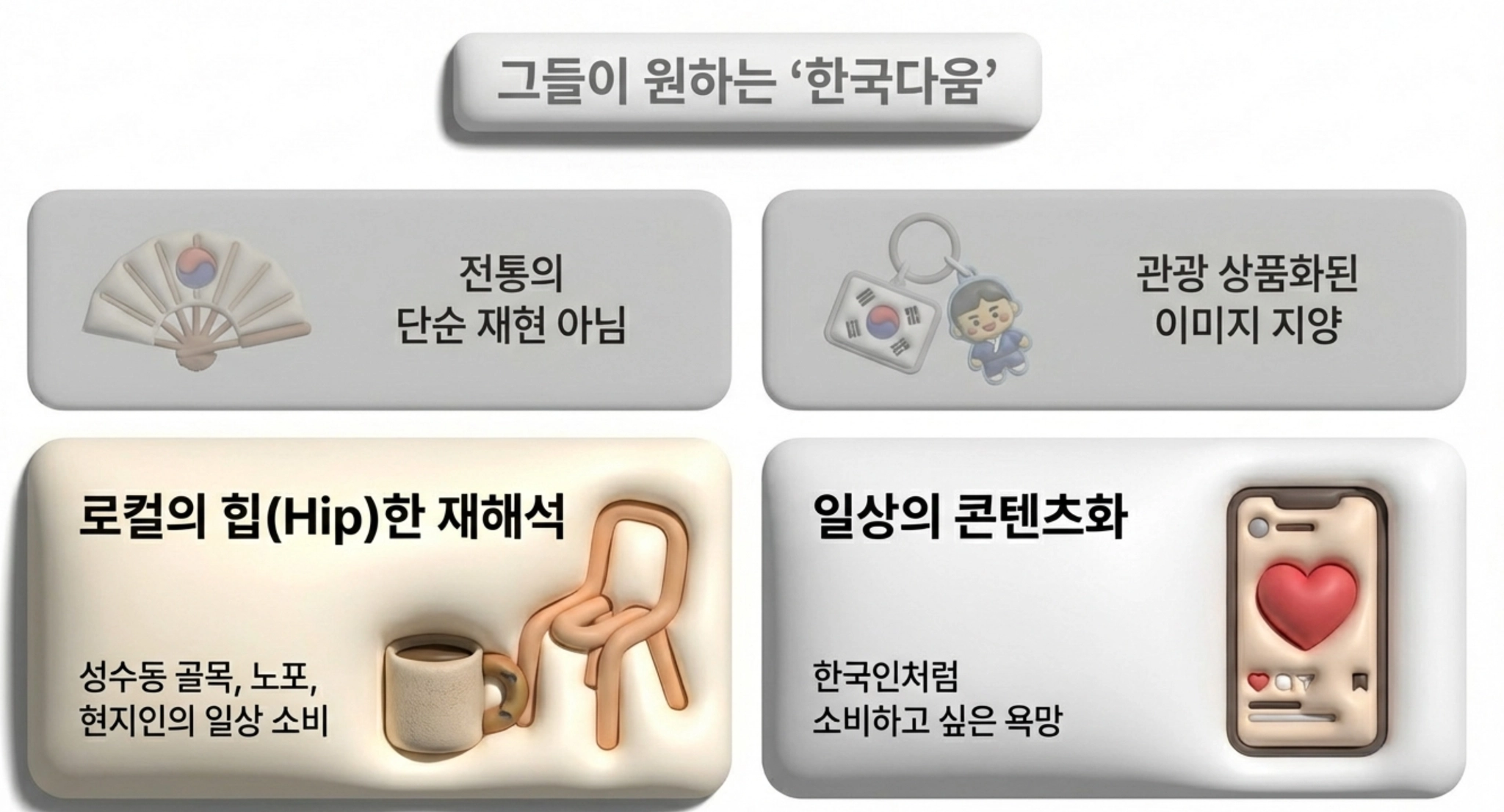 그들이 공통적으로 원하는 것이 있다면, 그것은 ‘한국다움’이다. 여기서 말하는 한국다움은 전통의 재현이나 관광 상품화된 이미지가 아니다. 오히려 성수동의 골목, 오래된 노포, 지역 주민들이 실제로 소비하는 공간과 방식에 더 가깝다. 외국인 관광객에게 로컬은 낡은 것이 아니라 힙한 것이고, 일상은 가장 강력한 콘텐츠가 된다. 그들은 한국에서 가장 한국적인 것을, 한국인처럼 소비하기를 원한다. 그리고 그 경험이 그들만이 할 수 있는 것이 될 때, 그것은 가치가 된다.