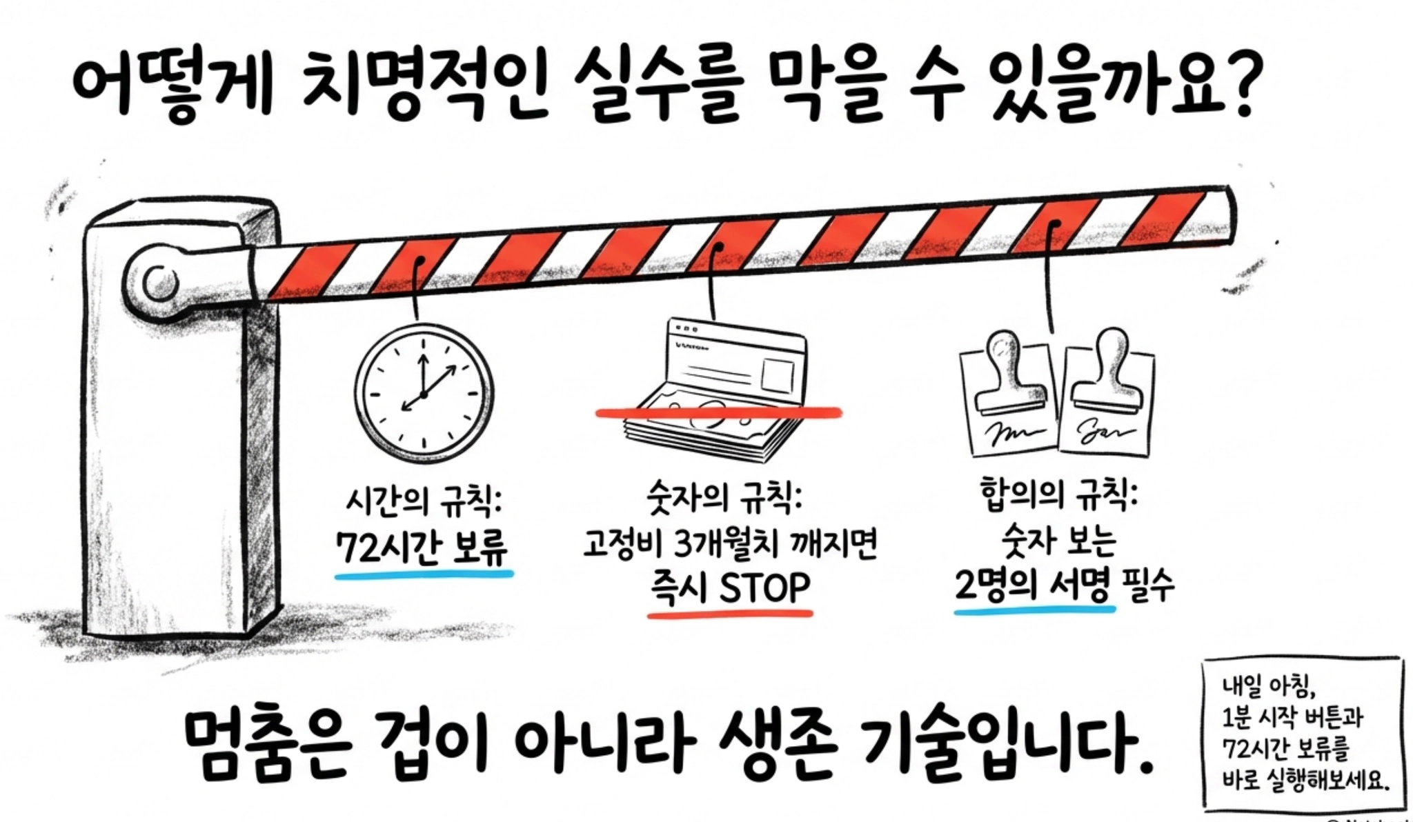 멈춤을 만드는 방법은 두 가지면 됩니다. 첫째는 시간입니다. 큰 결정은 오늘 결정하지 않는 규칙을 세우세요. 최소 하룻밤은 두고, 가능하면 72시간을 잡으세요. 둘째는 숫자입니다. 결정에 대한 철회 조건을 숫자로 한 줄 정해두세요. 대표님들이 체감하기 쉬운 기준은 보통 이겁니다. 통장에 고정비 3개월치가 깨지면 즉시 축소. 이 숫자 기준이 없으면 계속 버팁니다. 버티다가 손실이 누적되고 회복이 어려워집니다.