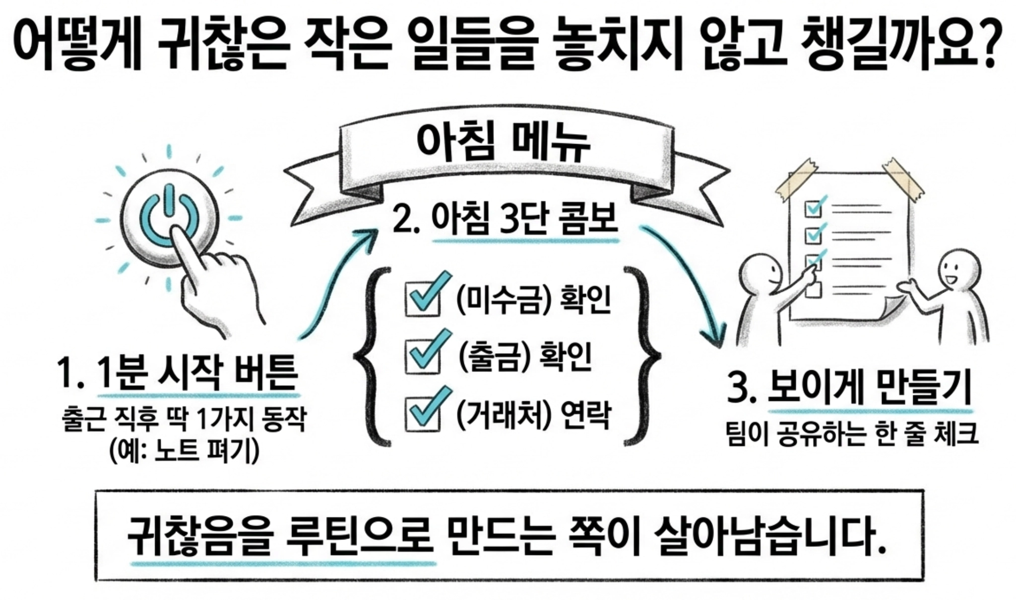작은 결정은 ‘루틴’이 되어야 합니다. 작은 결정이라는 건 되돌릴 수 있고, 실패해도 회사가 치명상을 입지 않는 일입니다. 그런데 이런 일들이 매일 쌓이면 결과가 갈립니다. 사장님이 바쁜 날은 반드시 오고, 사람은 바쁠수록 원래대로 돌아갑니다. 그래서 저는 ‘1분짜리 시작 버튼’을 먼저 만들라고 권합니다. 출근하자마자 1분 안에 끝나는 첫 동작 하나만 정하는 겁니다. 노트 펴기, 미수금 리스트 열기, 오늘 출금 예정 확인하기, 재고나 예약이나 클레임 리스트 열기. 작아야 매일 쉽게 시작할 수 있습니다.