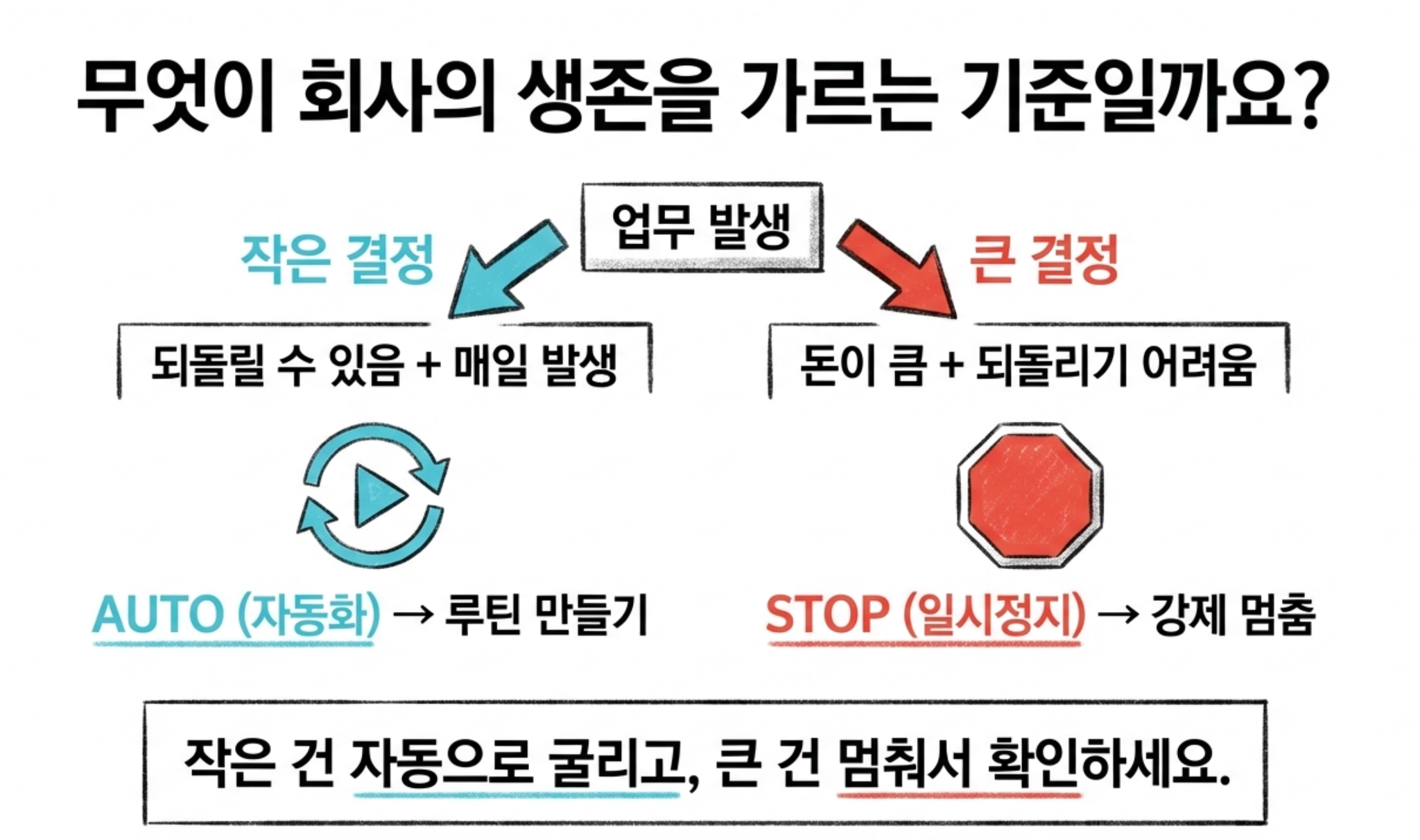 사업을 흔드는 실수는 생각보다 단순합니다. 첫째는 매일 해야 할 작은 결정을 놓치는 실수입니다. 둘째는 한 번 잘못하면 돈이 크게 새는 큰 결정을 서둘러 버리는 실수입니다. 문제는 많은 대표님들이 이 두 가지를 같은 방식으로 처리한다는 겁니다. 작은 일은 정신력으로 버티고, 큰 일은 기세로 밀어붙입니다. 그러면 작은 일은 계속 빠지고, 큰 일은 한 번에 크게 터집니다. 작은 건 자동으로 굴리고, 큰 건 한번 멈추고. 이 기준이 있느냐 없느냐가 결국 지속하는 회사를 가릅니다.