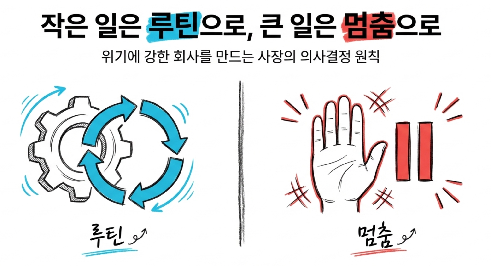작은 결정은 루틴으로, 큰 결정은 멈춤으로. 이 두 문장을 회사의 운영 기준으로 걸어두면 대표님 머릿속이 정리됩니다. 매일 하는 일은 자동으로 돌아가게 만들고, 큰 돈이 걸리는 일은 멈춰서 확인하게 만드세요. 그 기준이 있으면 바쁜 날에도 덜 흔들리고, 외부 충격이 와도 덜 깨집니다.