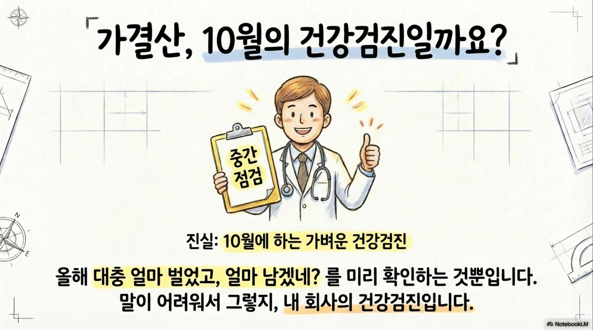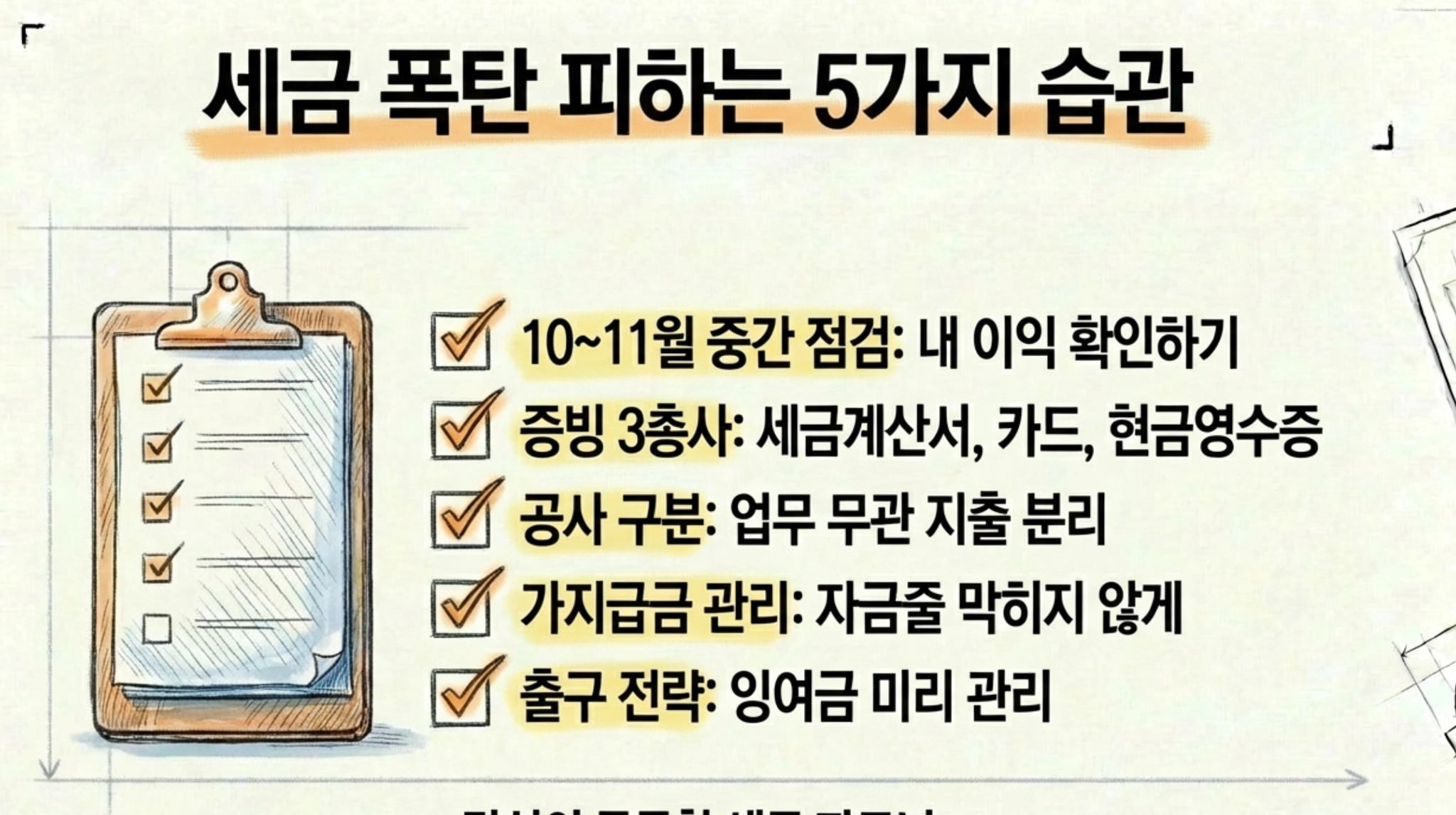 정리하면 이렇습니다. 10월이나 11월에 중간 점검 한 번. 적격증빙 3가지 습관화. 업무무관 지출은 애초에 분리. 가지급금이 쌓이지 않게 흐름 관리. 미처분이익잉여금은 언젠가 큰 문제로 번질 수 있으니 미리 출구전략 고민. 이 다섯 가지만 해도, 세금 때문에 당황하는 일이 확 줄어듭니다.