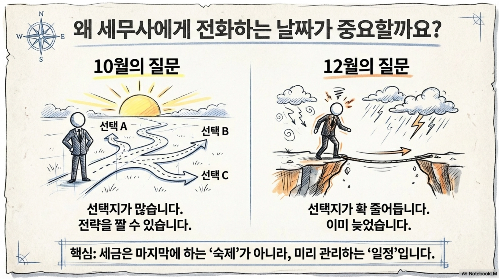 그래서 저는 대표님들께 이렇게 권합니다. 세무는 신고 대행만 잘한다고 끝나지 않습니다. 대표님 사업의 흐름을 미리 보고, 위험이 쌓이기 전에 정리하고, 필요한 선택지를 만들어주는 게 진짜 역할입니다. 세금은 “줄여주세요”라고 말하는 순간 줄어드는 게 아니라, “미리 봤더니 줄일 수 있는 길이 생기더라” 이 흐름에서 줄어듭니다.