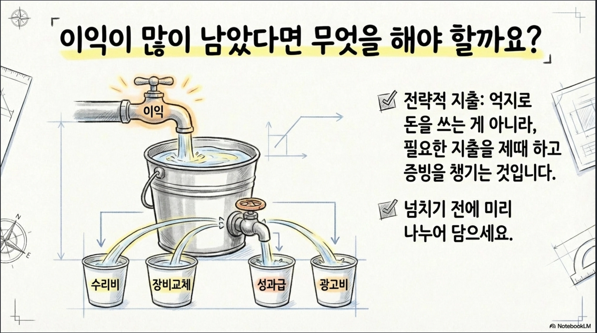 그리고 가결산의 진짜 장점이 여기서 나옵니다. 10~11월에 미리 이익을 보면, ‘올해 안에 꼭 해야 하는 지출’과 ‘내년으로 미뤄도 되는 지출’이 구분됩니다. 올해 이익이 너무 크다면, 어차피 해야 할 수리비나 장비 교체, 광고비, 성과급 같은 걸 연말 전에 집행하는 선택도 생깁니다. 핵심은 억지로 돈을 쓰자는 게 아니라, 필요한 지출을 제때 하고 (지출시기 조절) 증빙을 제대로 챙기자는 겁니다.