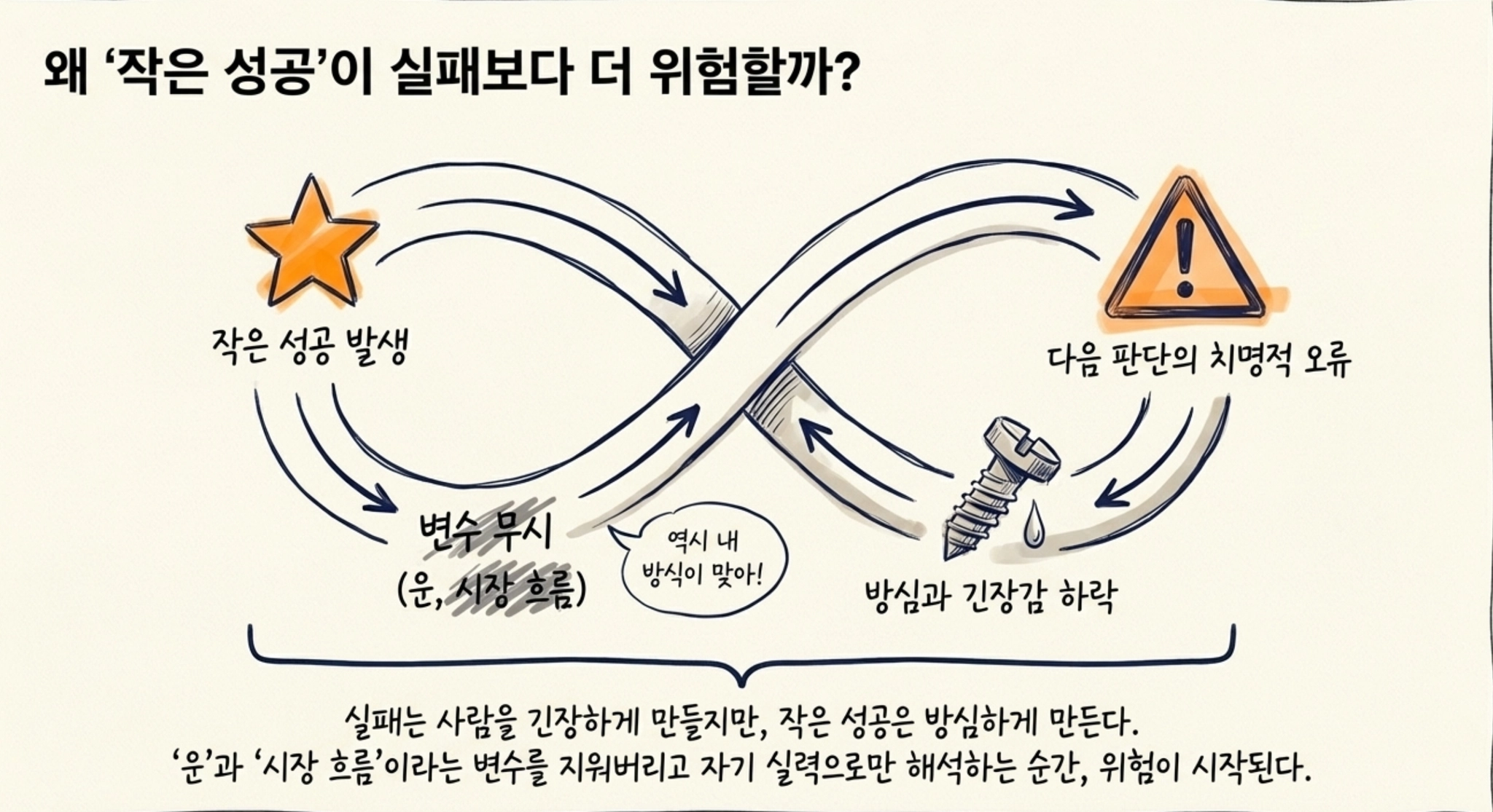 사업 판단도 마찬가지입니다. 매출이 조금 오르면 이 방식이 정답 같고, 고객 반응이 좋으면 앞으로도 계속 통할 것처럼 느껴집니다. 그래서 어느 순간 사장은 방법을 믿기 시작합니다. 하지만 사업에서 무서운 것은 ‘성공 경험’입니다. 실패는 사람을 긴장하게 만들지만, 작은 성공은 사람을 방심하게 만듭니다. 그래서 잘된 이유를 제대로 따져보지 않고 자기 실력으로만 해석하는 순간, 다음 판단이 흔들릴 가능성이 커집니다. 운이 섞여 있었을 수도 있고, 시장 흐름이 잠깐 도와준 것일 수도 있고, 경쟁자가 약했을 수도 있습니다. 그런데 그 모든 변수를 빼고 ‘역시 내 판단이 맞았다’라고 믿는 순간 위험이 시작됩니다.
