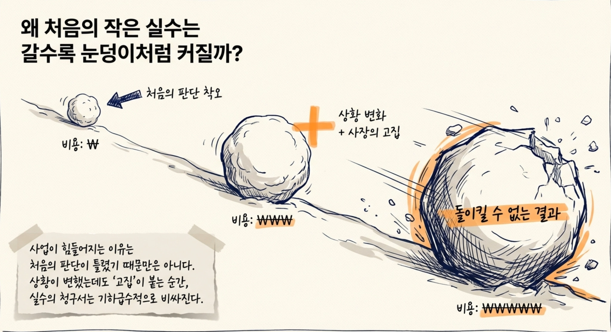 사업을 하다 보면 처음에는 맞아 보였던 판단이 시간이 지나면서 틀어지는 일이 자주 생깁니다. 사람을 뽑을 때도 그렇고, 가격을 정할 때도 그렇고, 광고를 시작할 때도 그렇고, 새로 시작한 서비스가 기대만큼 반응을 얻지 못할 때도 그렇습니다. 그런데 많은 사장님들이 힘들어지는 이유는 처음 판단이 틀렸기 때문만은 아닙니다. 더 큰 문제는 이미 상황이 달라졌는데도 그 판단을 바꾸지 못하는 데 있습니다. 처음 실수는 작을 수 있습니다. 하지만 고집이 붙는 순간 그 실수는 점점 비싸집니다.
