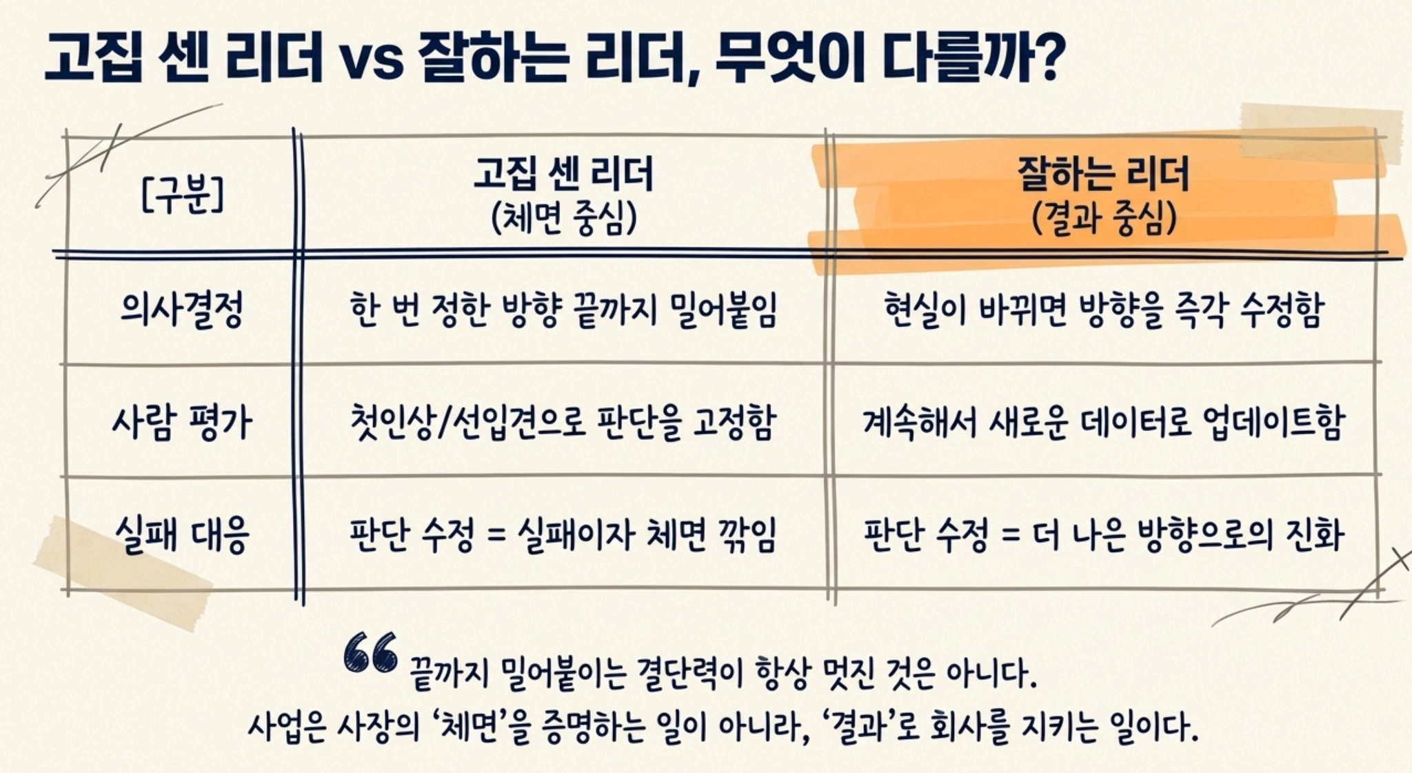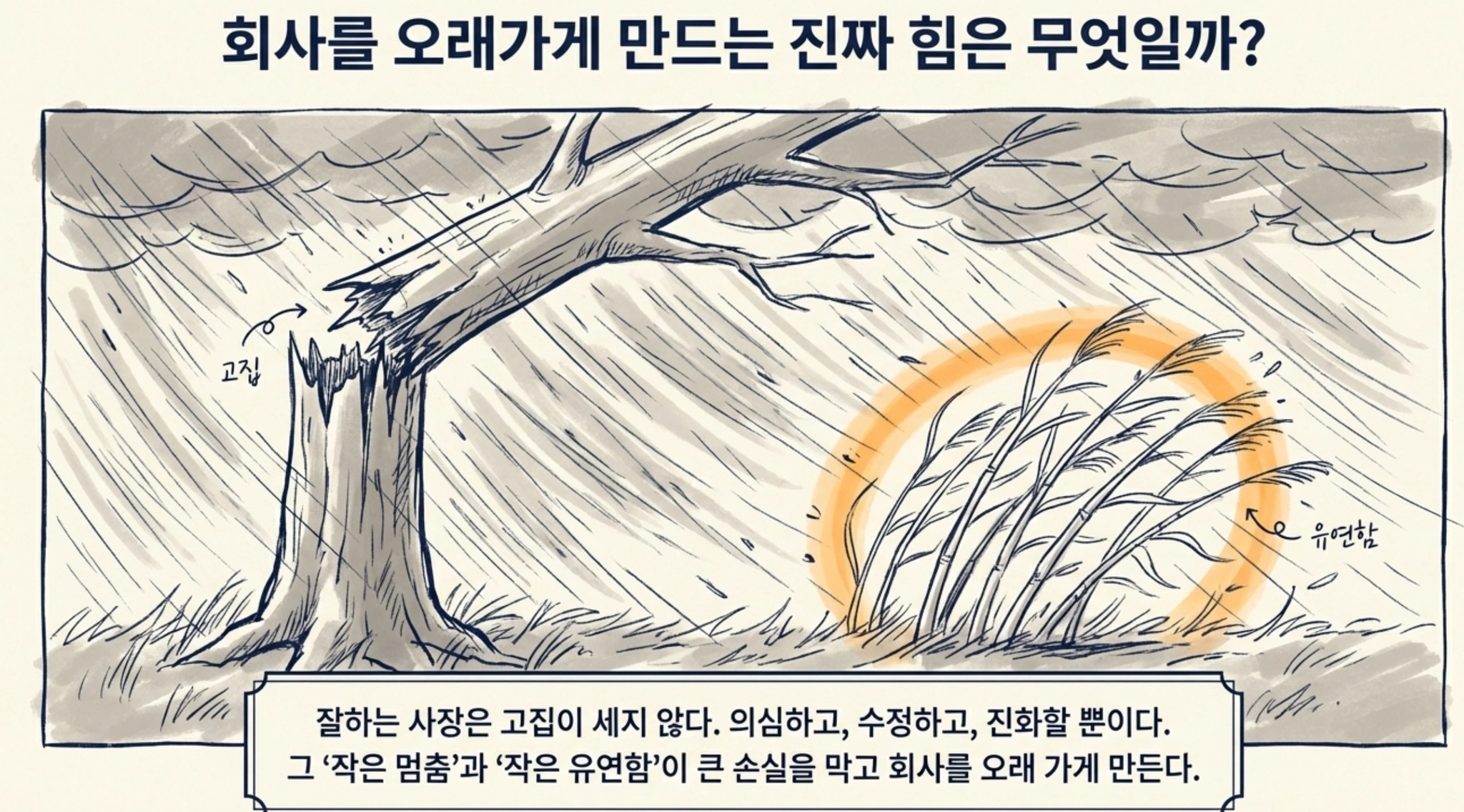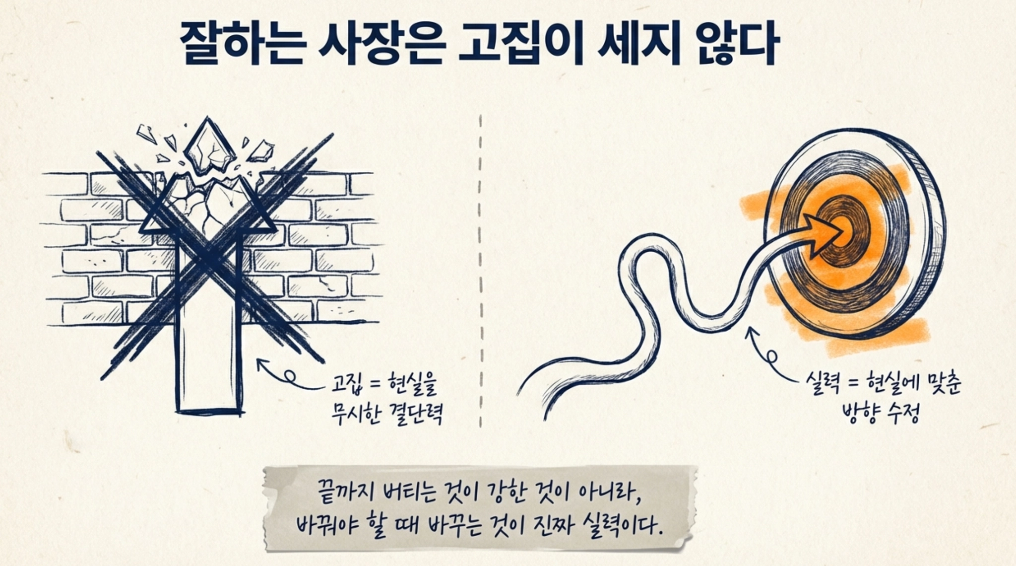 결국 잘하는 사장은 고집이 센 사장이 아니라, 수정할 줄 아는 사장입니다. 끝까지 버티는 사람이 강한 것이 아니라, 바꿔야 할 때 바꿀 수 있는 사람이 더 강합니다. 사업은 자존심을 증명하는 일이 아니라 회사를 지키는 일입니다. 그래서 사장에게 필요한 것은 언제나 확신이 아닙니다. 오히려 필요한 것은 내 판단을 한 번 더 의심해 보는 습관입니다. 그 작은 멈춤이 큰 손실을 막고, 그 작은 유연함이 회사를 오래 가게 만듭니다.