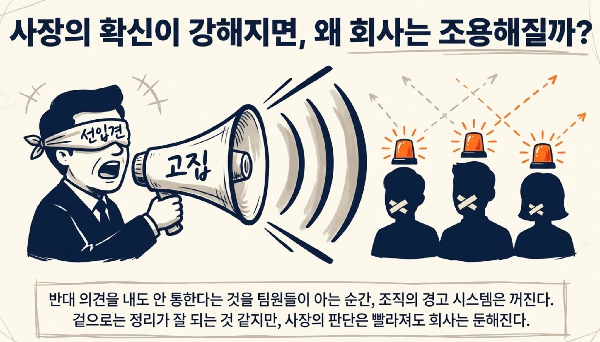 사장의 확신은 조직에도 큰 영향을 줍니다. 사장이 확신이 너무 강하면 팀원들은 점점 말을 아끼게 됩니다. 반대 의견을 내도 분위기만 불편해지고, 결국 사장님 생각대로 갈 것 같으면 굳이 말하지 않게 됩니다. 그러면 회사는 조용해집니다. 겉으로는 정리가 잘 되는 것처럼 보일 수 있습니다. 하지만 실제로는 위험 신호가 올라오지 않는 조직이 됩니다. 팀원들이 입을 닫는 순간 사장은 더 외로워지고, 더 외로워질수록 자기 생각에 더 갇히게 됩니다. 그렇게 되면 판단은 더 빨라질지 몰라도, 회사 전체는 더 둔해집니다.