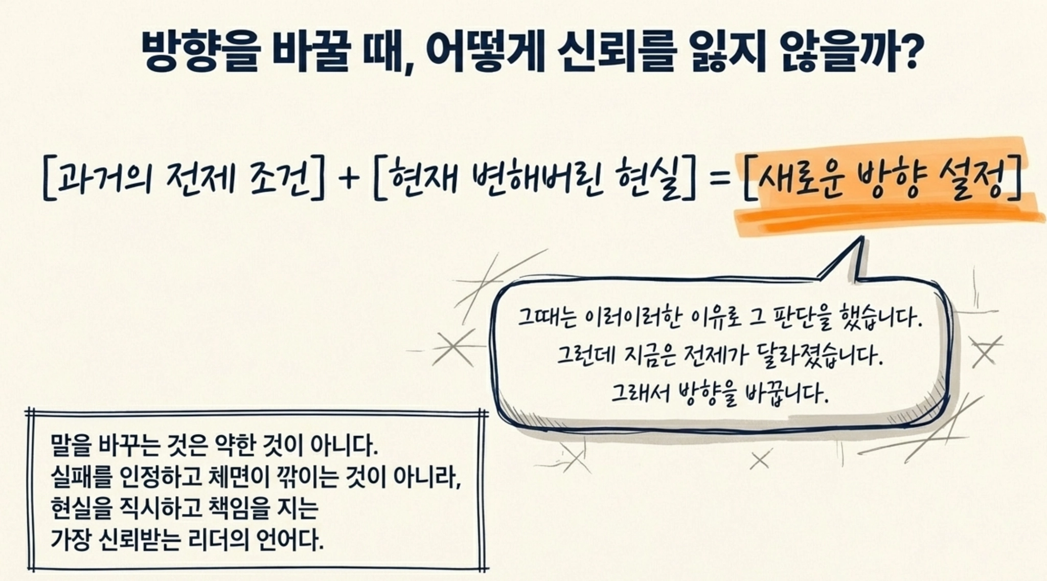 좋은 리더는 처음부터 완벽한 답을 내는 사람이 아닙니다. 좋은 리더는 틀렸을 때 빨리 알아차리고, 바꿔야 할 때 설명하고, 다시 방향을 잡을 수 있는 사람입니다. 그런데 많은 리더가 판단을 바꾸는 일을 실패처럼 느낍니다. 예전에 했던 말과 지금 말이 다르면 체면이 깎인다고 생각합니다. 하지만 저는 오히려 반대라고 봅니다. 진짜 신뢰를 주는 리더는 상황이 바뀌었을 때 이렇게 말할 수 있는 사람입니다. 그때는 이러이러한 이유로 그 판단을 했습니다. 그런데 지금은 전제가 달라졌습니다. 그래서 방향을 바꿉니다. 이 말은 약한 말이 아닙니다. 이 말은 현실을 보는 말이고, 책임을 지는 말입니다.