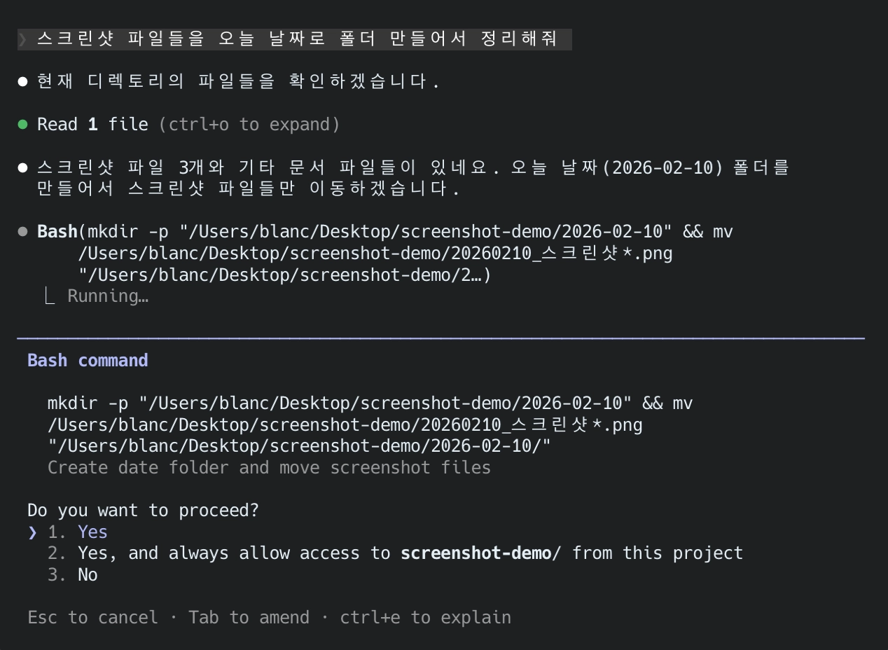 파일을 이동하거나 삭제하기 전에 Claude가 확인을 요청합니다. 무엇을 할 것인지 보여준 뒤, 승인 여부를 물어봅니다. Y를 누르면 실행하고, N을 누르면 취소합니다.