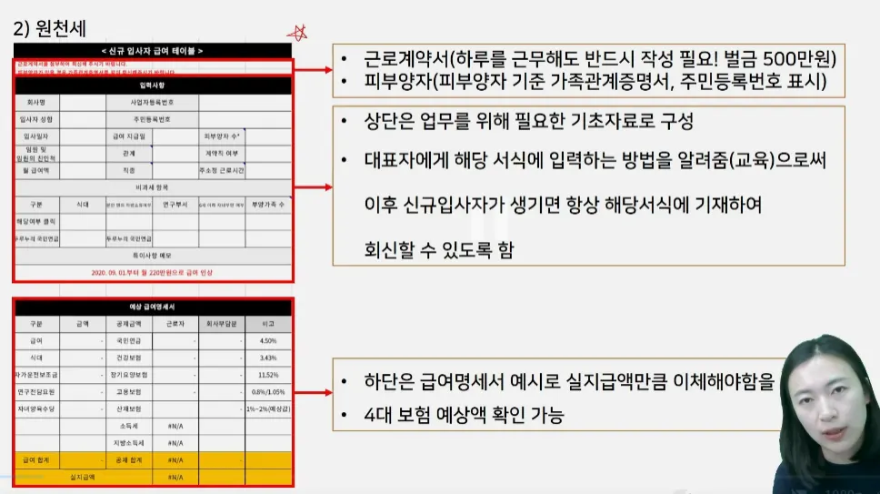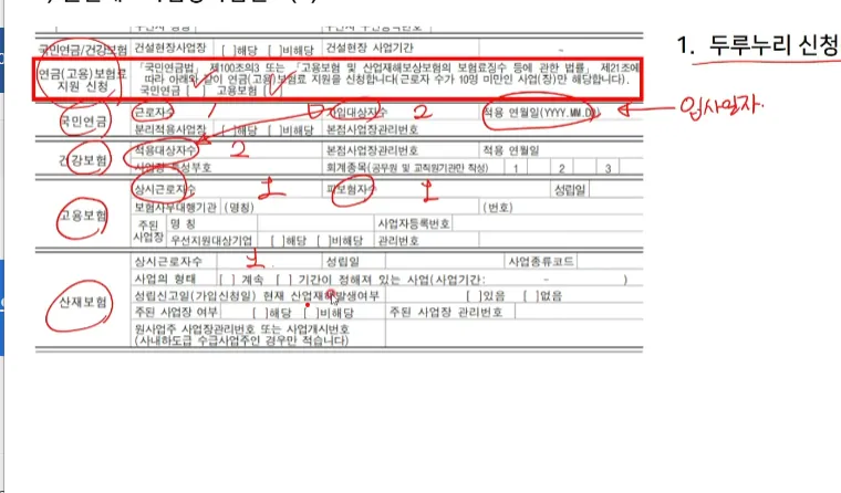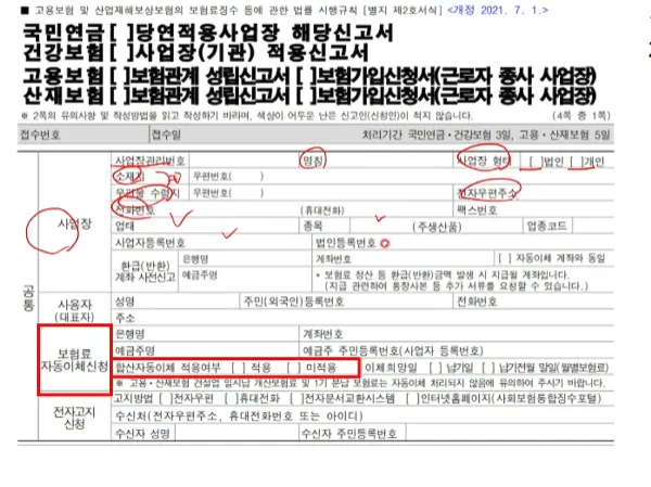 필수입력 - 회사명, 사업자등록번호, 입사자성함, 주민등록번호, 입사일자, 급여지급일(회사를 기준으로해서 한다.), 피부양자수, 임원 및 임원의 친인척(관계), 계약직여부(실업급여), 월급여액, 직종, 주소정근로시간