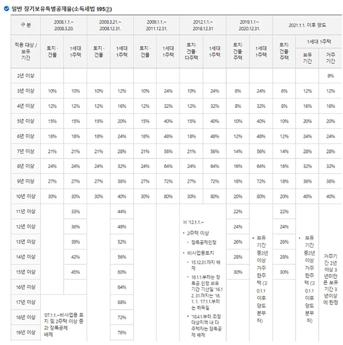 보유기간 3년 이상부터 양도세를 공제해주는 제도, 1세대1주택자와 다주택자와 적용되는 공제율이 다름 (조정대상지역에서는 배제)