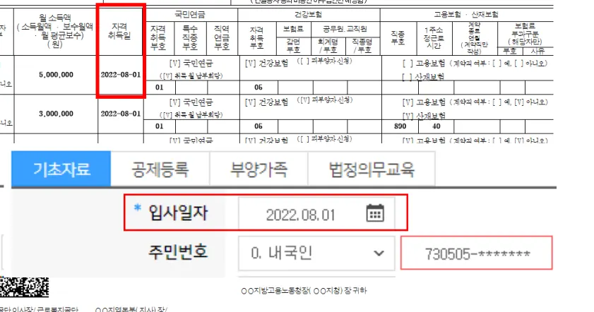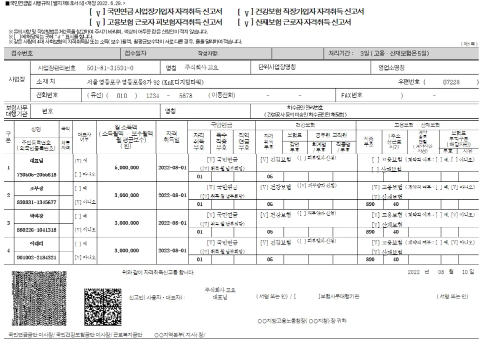 4대보험 지원 1명 등록 (취득신고서, 성립신고서, 무보수확인서)