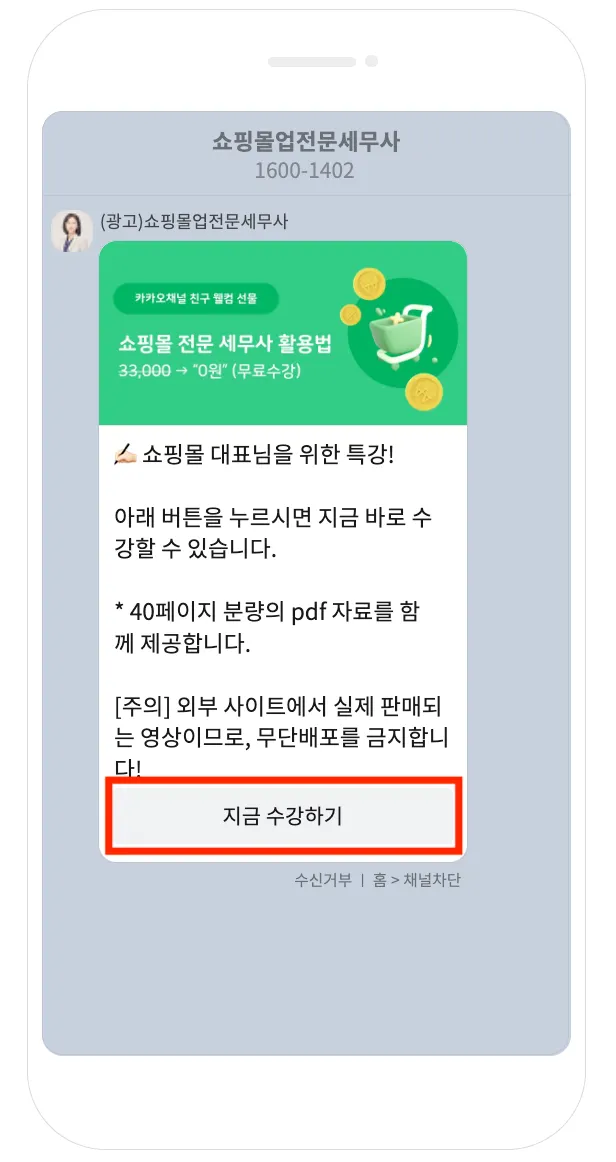 3. 친구 추가 직후 자동 메세지가 발송됩니다. [지금 수강하기] 버튼을 눌러주세요.