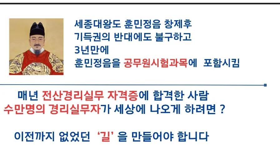 2.세종대왕도 욕망이 있었다. 어려운 한자로 고통당하는 백성들이 쉬운 문자를 통해서 억울한 사람이 생기지 않도록 쉽게 의사소통하는 꿈을....사신들이 반대하는 상황에서도뜻을 굽히지 않고 결국에는국가공무원시험에 훈민정음을 정식과목으로 채택하게 되었다는 스토리가 있다는 사실을 알고 있나요?