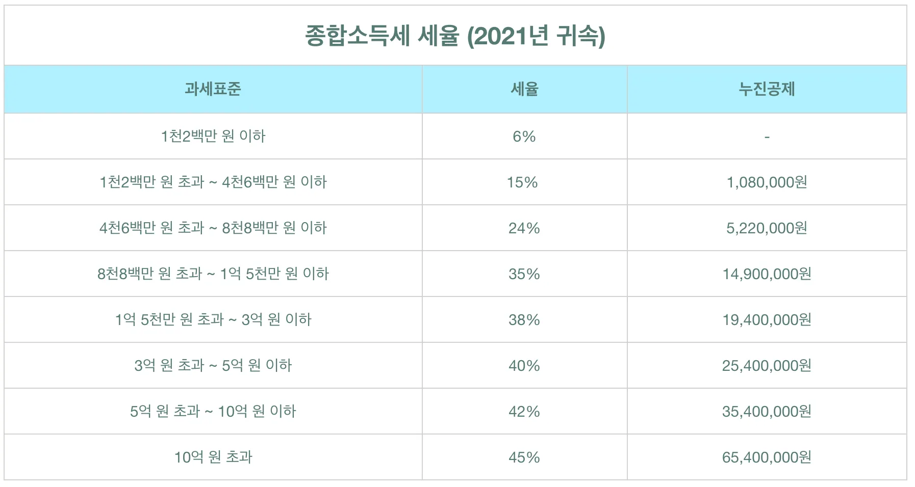 과세표준 구간에 따라서 세율이 다르게 적용되는데 최소 6%부터 시작해서 최대 45%까지 적용을 받을 수 있습니다. 구간에 따라서 누진공제액도 있는데 만약 1,200만 원 초과 4,600만 원 이하라면 세율은 15%이지만 누진공제로 108만 원을 공제를 받을 수 있습니다.