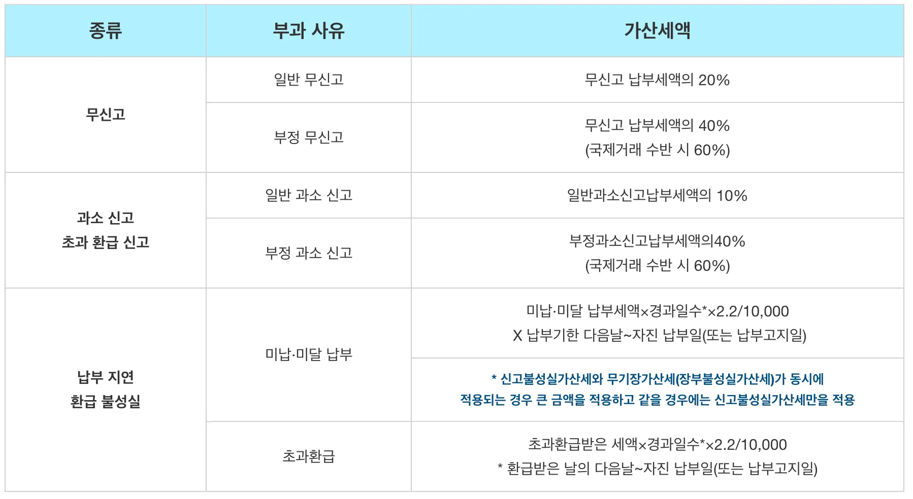 종합소득세는 제때 제대로 신고를 해야 합니다. 무신고일 경우 일반 무신고는 납부 세액의 20%이며 부정 무신고는 납부세액의 40%가 가산세입니다. 부정 과소 신고, 일반과소 신고 등 각 항목에 따라서 가산세가 붙을 수 있으며 지급명세서 보고 불성실, 장부 기록 기장 불성실 가산세도 있습니다.