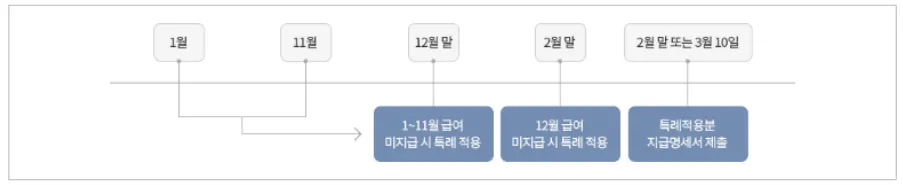 다만, 일정시점까지 지급하지 아니한 경우 원천징수시기 특례가 적용되어 특례 적용시기에 지급한 것으로 보아 원천징수한다.(원천징수시기 특례 규정이 적용 된 경우, 해당 지급명세서를 소득금액에 대한 과세연도가 종료일이 속하는 연도의 다음 연도 3월 10일까지 제출
