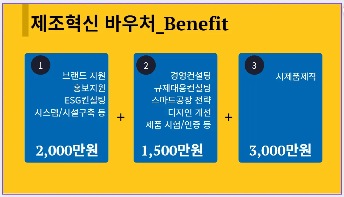 해당 바우처는 대한민국 중소 제조기업을 대상으로 최대 5,000만원 (자기 부담금 10% ~) 까지 지원 해주는 바우처 입니다.