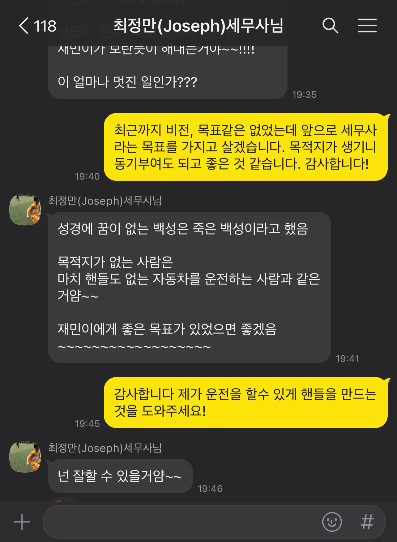 세무법인 청년들 본점에 온 후와 전이 너무 차이가 난다. 청년들에 오기 전인 면접을 볼 때만 해도 나는 ‘내가 뭘 하겠어’, ‘재능을 노력으로 이기긴 어려워‘, ’포기할래’ 같은 생각만 있었다. 면접을 본 후 조셉과 카카오톡으로 연락을 하며 꿈에 대해 얘기 했다.