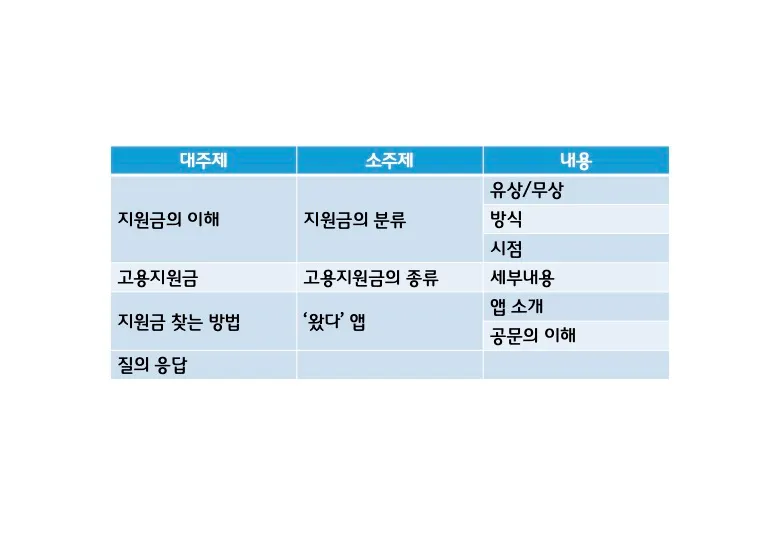 4 | 4 | 4 | 저에게는 도움이 많이 되었습니다. 청년일자리도약장려금에 대해서는 복습과 확인한 내용에 대해 좀 더 확신을 가질 수 있어 너무 좋았습니다.왔다 라는 앱을 알게 된 것도 앞으로 유용할 것 같습니다 그리고 지원금에 대한 전반적인설명은 제가 지원금을 찾을 때 키워드 역할을 할 것 같습니다 |