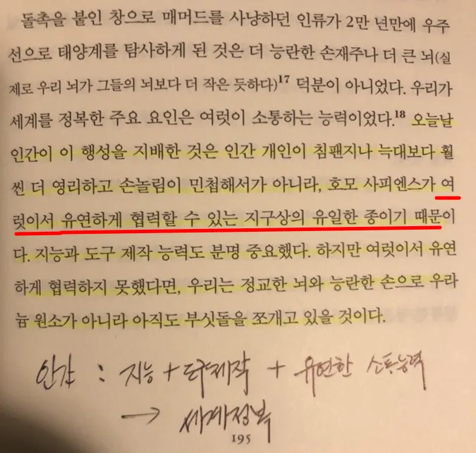 그것은 인간이 여럿이 소통하는 능력을 통해 유연하게 협력할 수 있는 지구상의 유일한 종이기 때문이다.