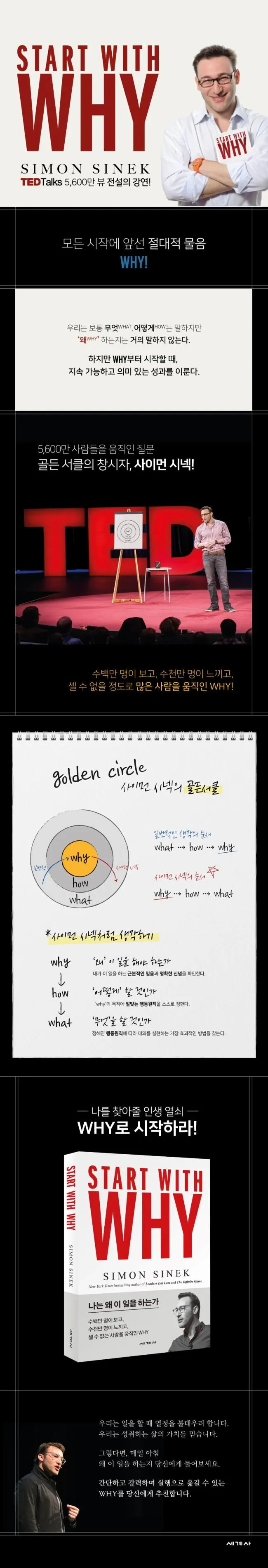 “우리의 일이 비전에 더 가까워지는 순간!”가장 단순하고 명료한 개념 하나가수천만 명에게 영감을 주고 셀 수 없는 사람을 변화시켰다? TED 5000만 뷰 기록? 아마존 최장기 베스트셀러? 뉴욕타임스 월스트리트저널 베스트셀러성공하는 사람과 기업은 무엇이 다를까? 오늘날 많은 개인과 조직이 시장에서 성과를 거두기 위해 상당한 시간과 비용을 들이고 있다. 하지만 노력이 결과와 반드시 비례하는 것은 아니다. 누군가는 실패하지만 다른 누군가는 대중의 지지를 받으며 성공을 이어나간다. 사이먼 시넥은 경쟁사회 속에서 전진에만 몰두하는 조직의 현주소를 지적하고 흔들리지 않는 가치로 성공한 기업과 리더 사례를 보여주며 인류가 각자의 일에서 본질을 발견하여 열의를 가질 수 있는 방향을 제시한다. 그는 목적과 가치를 바르게 세우는 것에서 일이 시작되어야 한다는 자신의 관점을 “WHY로 시작하라(Start with WHY)”라는 표현으로 정의했다. 시넥의 메시지는 TED 첫 강의부터 큰 반향을 불러일으키며 세계적으로 널리 퍼졌다. 많은 리더의 강연을 제치고 두 번째로 많이 재생된 영상에 이름을 올렸으며 10년 이상 재생 순위 TOP5 그리고 5000만 뷰라는 이례적인 기록을 남겼다.