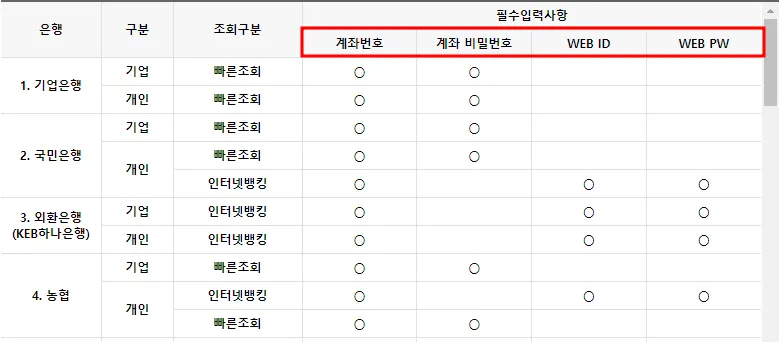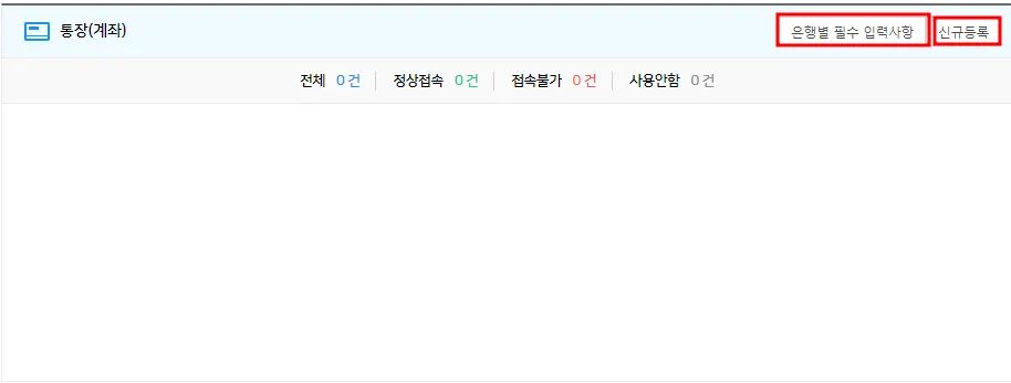 은행별 필수 입력사항을 확인 후 신규등록할 것