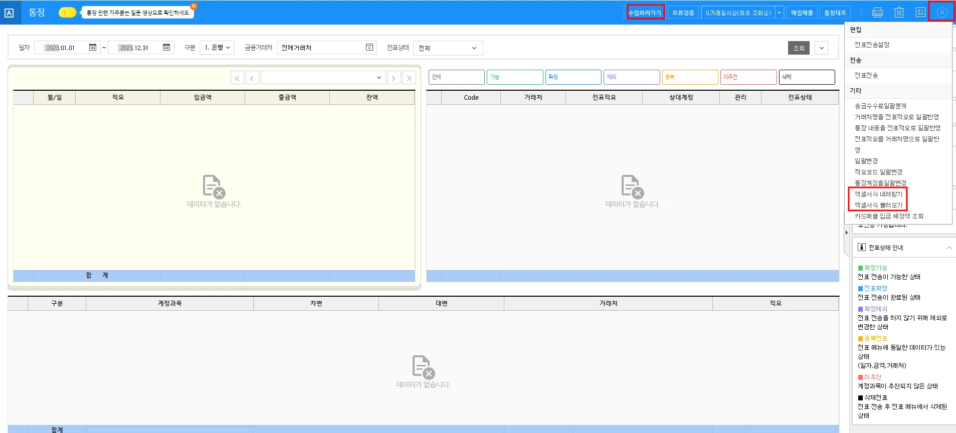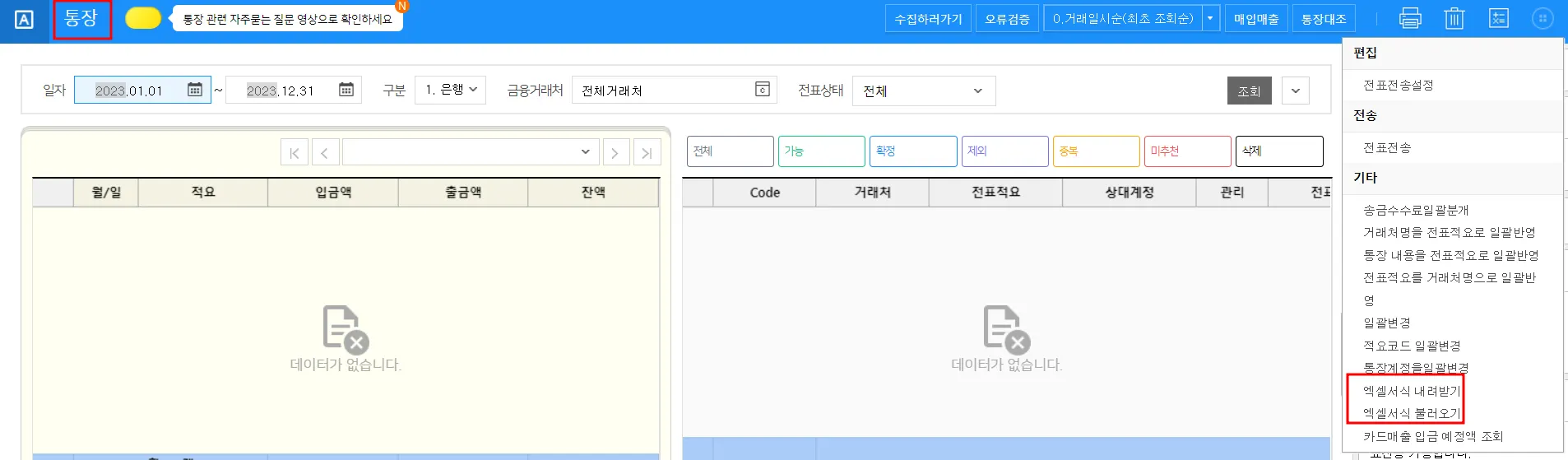 통장거래자동입력 기능 있다 → 엑셀 내역 불러오기(전체 내역)