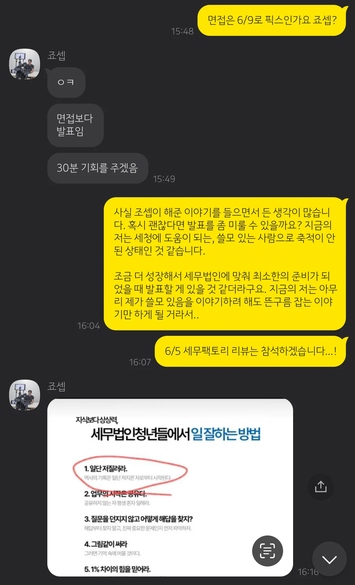 이 카톡은 5월 말 세무팩토리가 끝나고 난 뒤의 이야기입니다.
