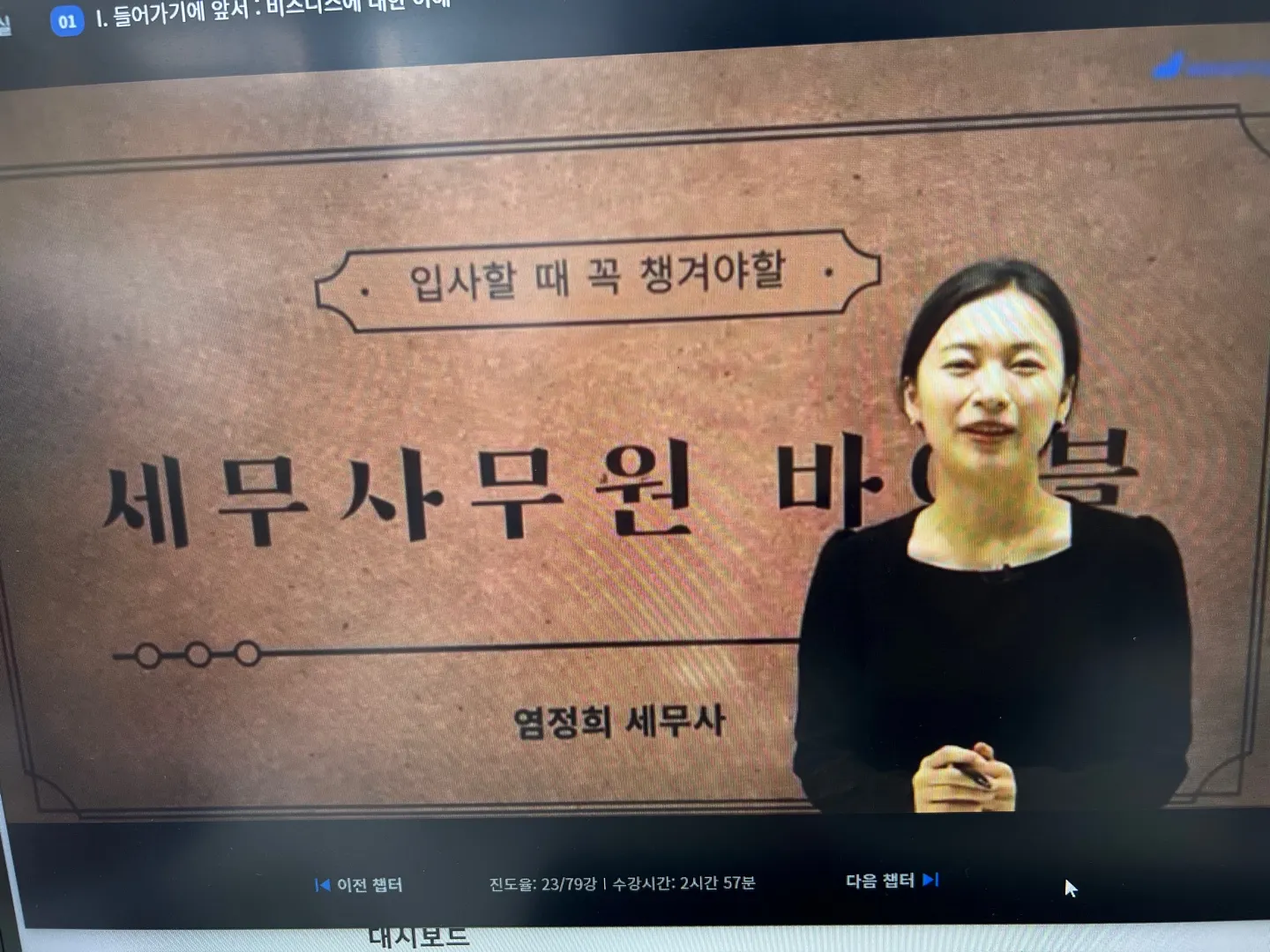 오늘은 회사에 가면서 무엇을 할지 되게 설레며 회사에 왔다 “Anne”이 염정희 세무사님에 “입사할 때 꼭 챙겨야 할 세무사무원 바이블”이라는 강의를 시청하고 그 강의를 통해 무엇을 배웠는지 그 강의를 통해 무엇을 얻었는지 생각하고 오후에 물어보신다고 하셨다.